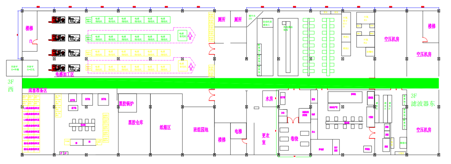 l 從宏觀層面,考慮整個濾波器生產(chǎn)車間的功能區(qū)域,減少物流搬運次數(shù);構建連續(xù)流的生產(chǎn)線,導入物流配送系統(tǒng)應用ECRS原則、簡易自動化等方法,重新提排布生產(chǎn)線。
