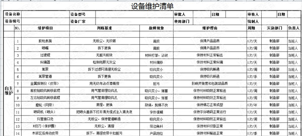 在自主與專業(yè)維護清單完成后,根據(jù)設(shè)備故障的判斷基準(zhǔn)、故障現(xiàn)象、維護的周期、維護的部門和責(zé)任人,制定自主與專業(yè)維護清單。