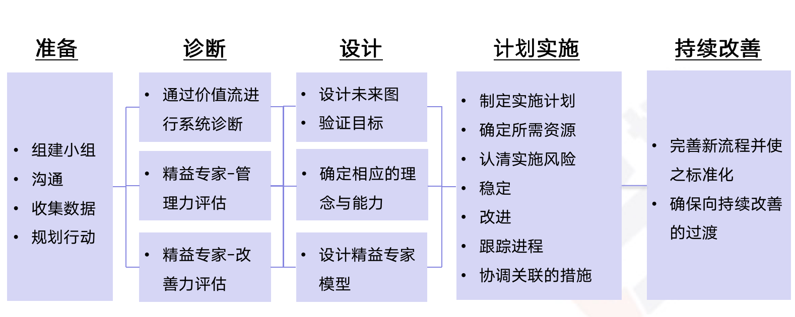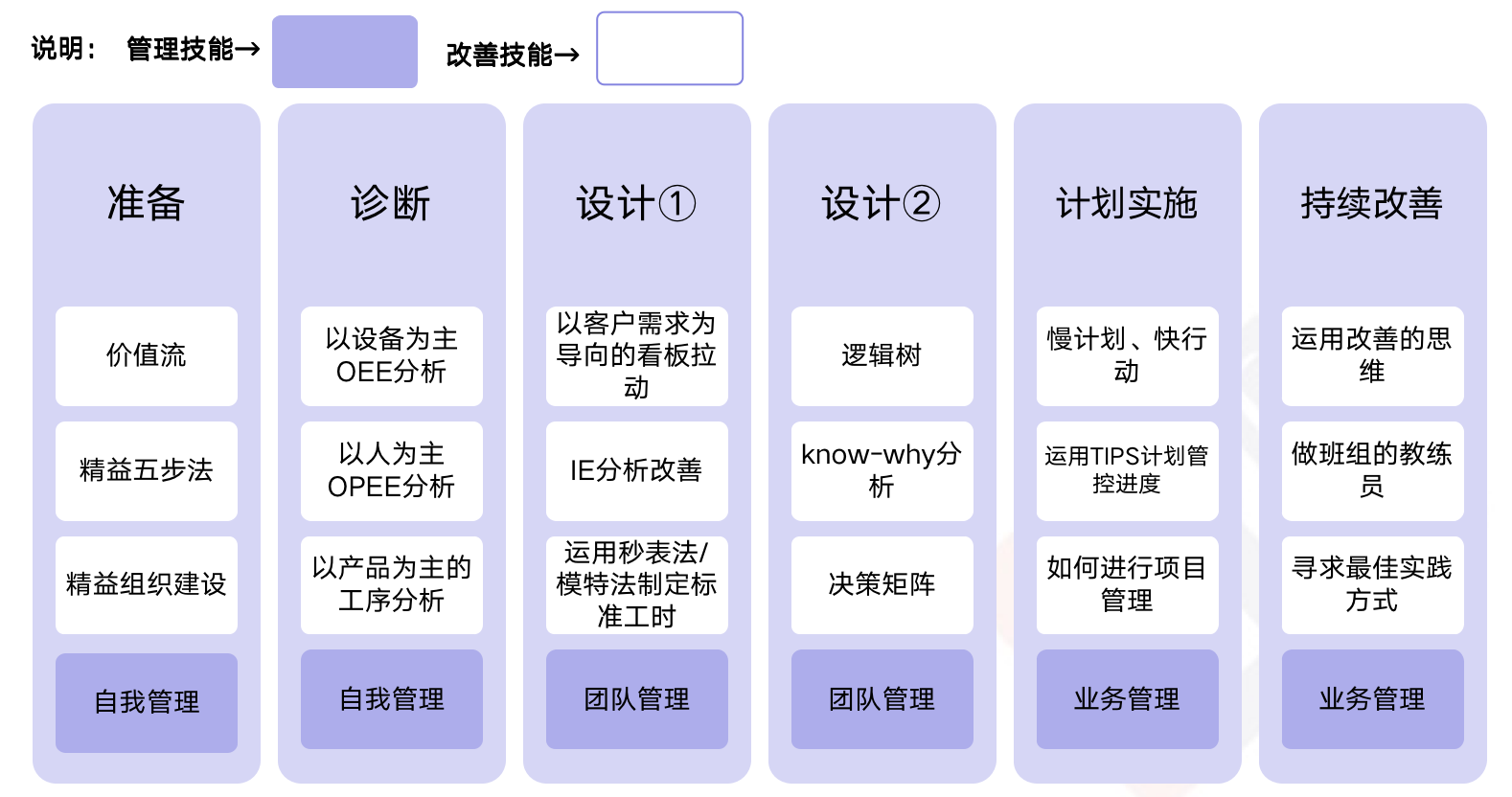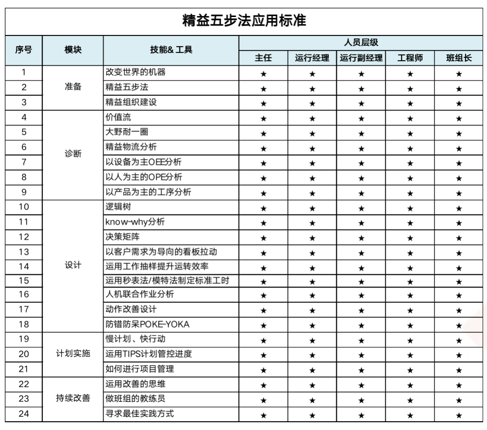 從精益五步法“準備、診斷、設計、計劃實施、持續(xù)改善” 和自我管理、團隊管理、業(yè)務管理等方面,梳理各層級人員應該掌握的技能;