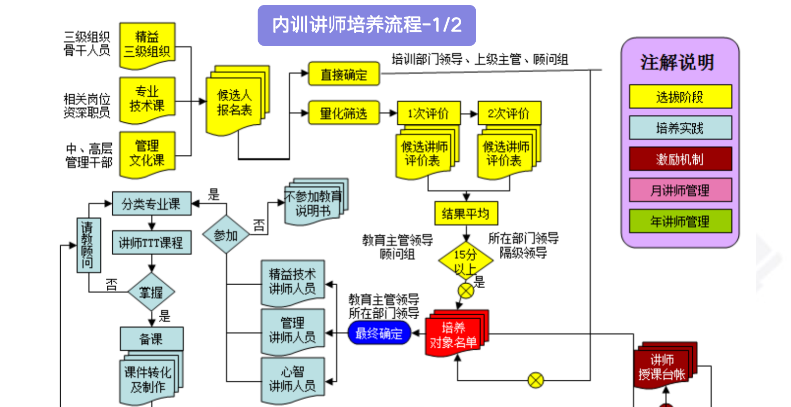 從公司角度建立內訓師培養(yǎng)與運營流程(包括講師選拔-講師培養(yǎng)實踐-講師激勵機制-月度講師管理-年度講師管理),與本期的博革咨詢式培訓同步培養(yǎng)貴司的種子講師。