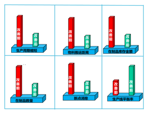 一、項目背景: 01 公司簡介 成立于2015年,是產銷研一體的自動化 產品/設備線束方案解決商。公司產品包含端子臺、繼電器模塊、 總線IO、非標設備線纜定制、整機線束打包、機器人線束、無塵 拖鏈及線纜全套外包、工業連接器、快速插線端子9大系列。廣泛 應用于汽車、3C、鋰電(新能源)、激光、光伏、半導體、傳統 制造等行業的自動化設備。 公司規模及產能在華南地區處于一線,銷售網絡覆蓋全國各大區 域,在深圳、蘇州、成都、長沙等核心工業城市均設立了銷售公司。 02 案例背景 因工廠需要搬遷到新工廠,而老工廠裝配采用工段式分離生產方式,(例:整條線進行剪編織,完成訂單后再轉下工段剝芯線,完成訂單后再搬運到下工序等) 公司的主要客戶為自動化 產品/設備生產商,需求生交期非常短,而且需要線束配套出貨,需現有生產方式過程中斷點多,導致生產周期長,為滿足出貨交期需要提前生產很多成品與半成品庫存,又間接導致現場WIP多,放置混亂,倉庫面積大,占用資金大等問題。 在新廠規劃與線體設計時迫切需要解決的這些問題。同時,現有的工廠生產模式還具有如下問題: 1 生產效率低 生產布置考慮不全面,布局不合理,工位不平衡,過程搬運多,部分工位作業節拍短,導致實際生產效率低 2 物流不順暢 沒有按產品工藝流程布局,物流交叉,迂回多,搬運距離遠,運行不順暢。 3 交付不及時 按訂單批量流動,生產過程線斷點多,生產過程放置時間長,導致部分訂單交付不及時。 4 員工搬運作業強度大 生產布局按功能布局,搬運距離長,次數多,按單量搬運并無搬運載具,單次搬運重,導致搬運強度大,效度低。 二、項目開展 01 項目方向確定: 根據現狀調查和分析,博革咨詢認為,打造按產品工藝連續流的生產方式,降低成本金額,核心工作是要縮短生產周期、降低中間再制品。 按產品工藝重新合理布局與設計連續流的生產線,增加并行工位間流動載具,并確定最小批量流動,是改變達到這一目標的治標又治本的好方法。 02 項目前期調查 1 鉆機裝配產品裝配工藝流程:工藝流程: 2 裝配時間測量 3 現有線體布局 03 方案設計與比較: 1. 作業臺使用單獨精益作業臺,方便調整優化 2. 按產品族分類設計產線,實現連續流動。 3. 將生產過程使用設備嵌入生產線 4. 線體中物料采用周轉小車 5. 跨距離搬運(如倉庫到產線,產線到包裝用AGV搬運 6. 因包裝需要各種線束配套,采用集中包裝方式 04 4.線體設計 05 工序分析與改善 根據ECRS原則對裝配工序進行調整。提高產線平衡率 06 布局改善實際效果 1 1.項目取得的效果: 2 項目推進感想 “如果你不能迅速把產品開發時間減半、訂貨時間減少70%、生產周期縮減80%,那你一定是哪兒做錯了”。因此,為了縮短生產周期,車間以組建生產線、工序間改善為抓手,著力實現生產周期優化。通過打破班組間壁壘,再造生產組織,整合4個班組到1個班組,將多個生產工序段拉成新的生產線,降低產線瓶頸工序時間,消除過程等待浪費。產線重組消除了從裁切到包裝搬運浪費,單件周轉距離從630米減少至80米,斷點12個降為3個,生產周期從48小時降至6小時。 實現一連續流生產的目的是降低在制品庫存,使生產中存在的浪費現象暴露出來,并不斷排除,使成本下降,而任何一個問題都會阻礙連續流的生產方式的順利進行。車間通過兩方面措施來實現:一是要在沒有庫存的前提下,實現在必要的時刻得到必要的零件,為使各種零件生產和供應同步,統一生產節拍,車間利用作業組合票和偏差調查表工具,并進行整改,著力消除工序內浪費;二是提高過程能力,著力解決排故時間長、信息交流不通暢、工藝紀律差等這些問題,實現作業標準化,課題累計完成改善29項。 生產線的升級解決了孤島式批量生產的方式,實現了連續流生產模式,在線庫存金額從60萬降為10萬,在制品從50000件降至5000件。車間在建設連續流生產方式時,遵循精益生產思想,通過連續流生產、ECRS工序改善培養多能工、使用自働化工裝等方式,逐步實現對原有生產模式的升級改造。項目取得了較好的效果。