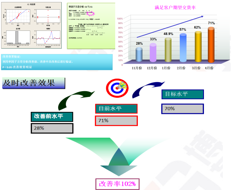 我們項目小組經(jīng)過為期6個月的努力,按照六西格瑪DMAIC的流程,有效的提銷售部、信用部、生產(chǎn)部之間的銜接效率,并取得了優(yōu)異的成績,縮短了公司的運轉(zhuǎn)周期,客戶期望的交付率由原來的28%提高到71%。 在項目的實施過程中,讓我們對6西格瑪有了新的認識: