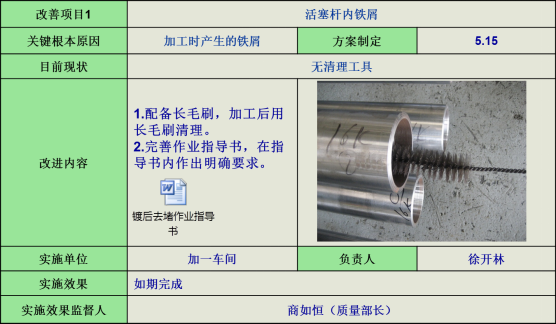 9)活塞桿內(nèi)鐵屑,針對(duì)加工時(shí)產(chǎn)生的鐵屑問(wèn)題,著重清理活塞桿內(nèi)鐵屑。