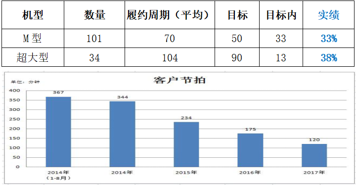分析當(dāng)前數(shù)據(jù),此兩款產(chǎn)品交付履約率分別為33%和38%,無法滿足客戶需求,且根據(jù)公司發(fā)展目標(biāo)和客戶未來需求預(yù)測,未來4年,客戶生產(chǎn)節(jié)拍將由367分鐘降低至120分鐘,因此通過價(jià)值流分析,縮短產(chǎn)品交付周期提高訂單準(zhǔn)時(shí)履約率成為迫切需要解決的一大問題。