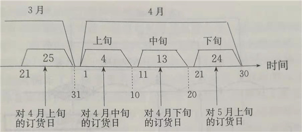 步驟1 來自銷售商的旬訂貨,各銷售商在汽車廠基本生產計劃確定的本月領取輛數的范圍內,將最終分規格的10天份的訂貨在7天至8天前通過微機聯網提供給汽車廠的銷售部門(參看圖1)。所謂最終規格,就是將剛才講過的按大分類的規格的車型,進一步通過對任選部件(訂貨要求的裝備)的選擇、車的顏色的選擇細分后的規格。接著,在生產管理部門按照旬訂貨來計劃分工廠,分生產線的日產量,這就是對前面所講述的基本生產計劃的修正,另外,豐田汽車公司還要向各家銷售商報告圖2那樣的配送預定表( Delivery Schedule),這個預定表的編制,從接受旬訂貨開始需要兩天的時間。