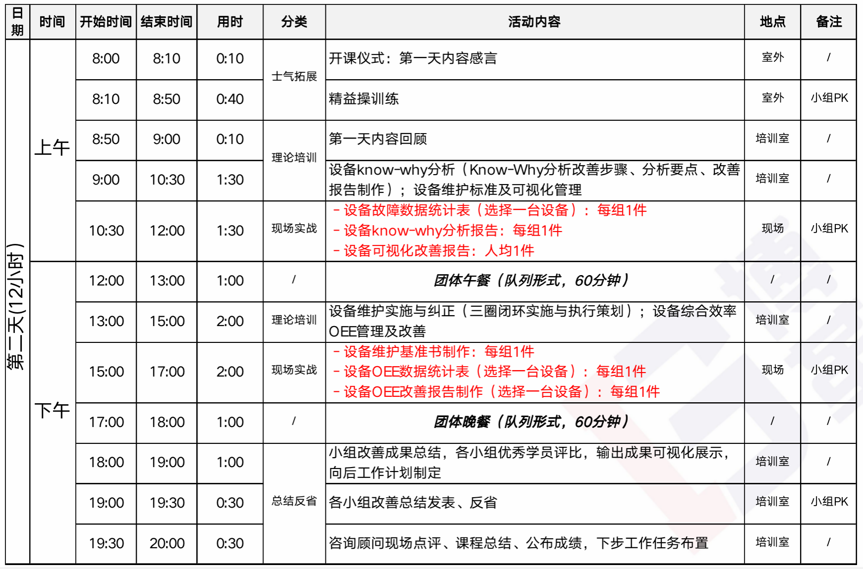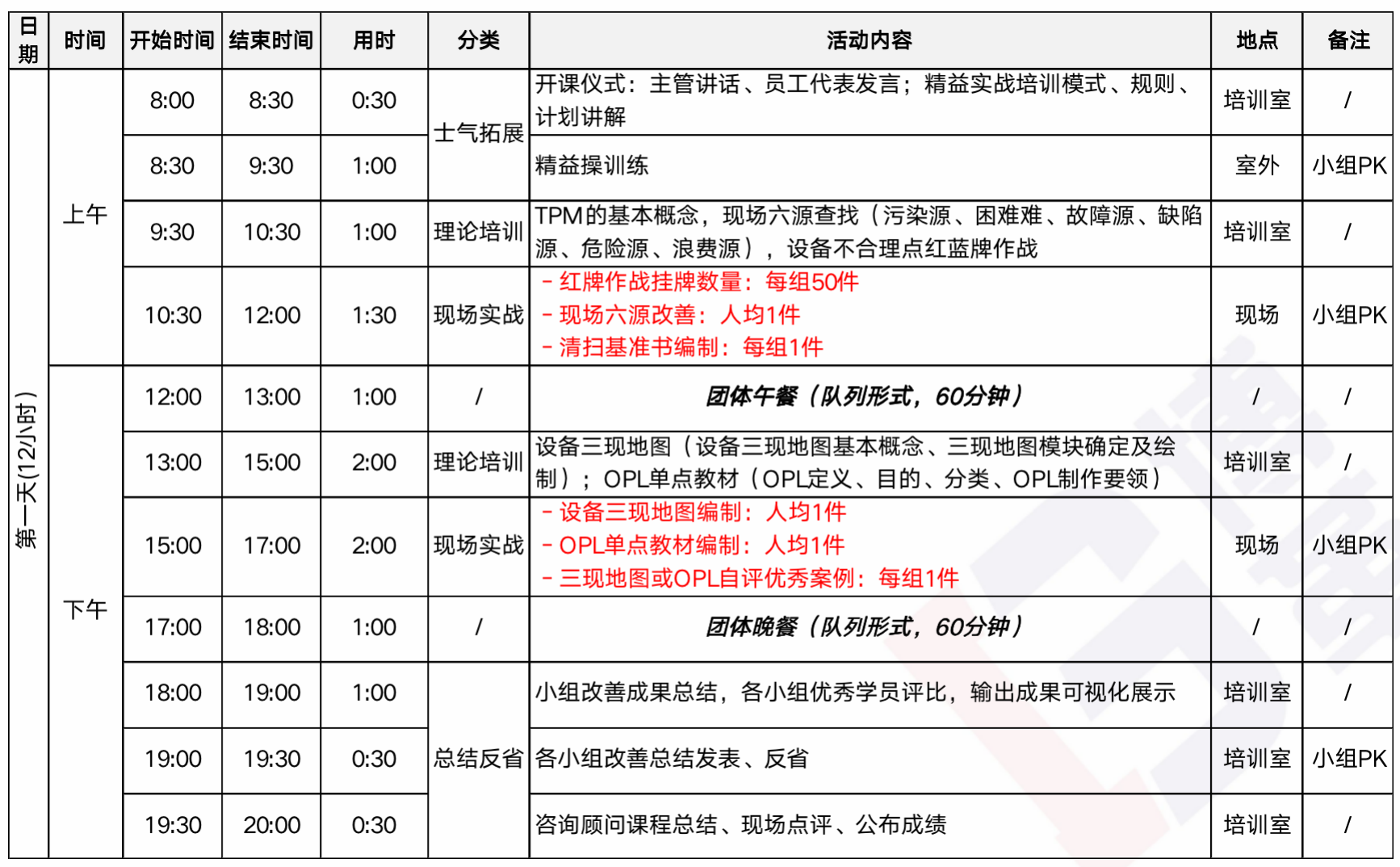 主題性:每次培訓會根據(jù)企業(yè)的需求選擇不同的主題,包含但不限于:現(xiàn)場5S、TPM、標準作業(yè)、六源改善、質(zhì)量改善、快速切換、產(chǎn)線平衡、工位布置、浪費識別與改善、QC/IE工具應用等