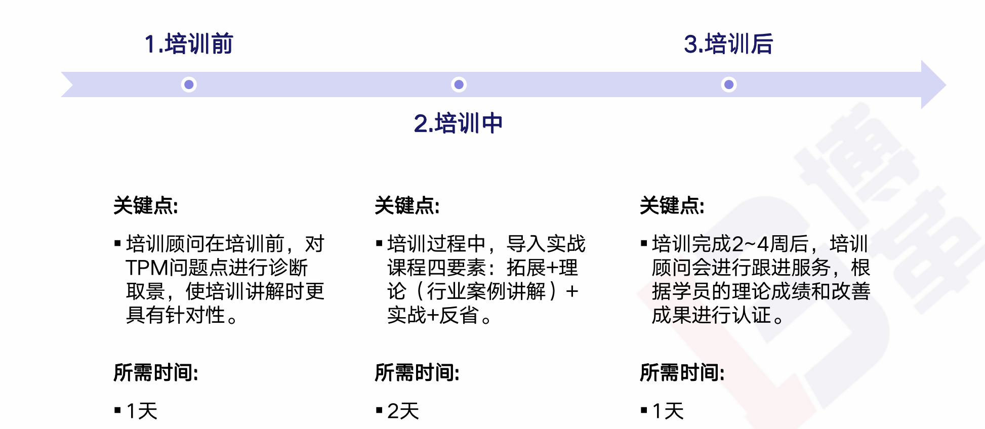 精益TPM實戰(zhàn)培訓是以全員生產(chǎn)性維護TPM管理為主題的精益實戰(zhàn)培訓。該培訓分為三個階段,通過【診斷取景+行業(yè)案例講解+現(xiàn)場實戰(zhàn)+培訓后跟蹤服務+認證】的實戰(zhàn)培訓模式,使學員能系統(tǒng)地學習TPM的理論知識,并迅速地應用在實際工作中,使其對TPM管理 工作產(chǎn)生認同感。